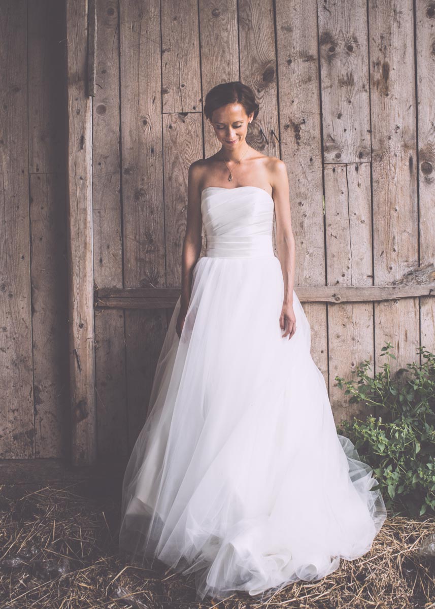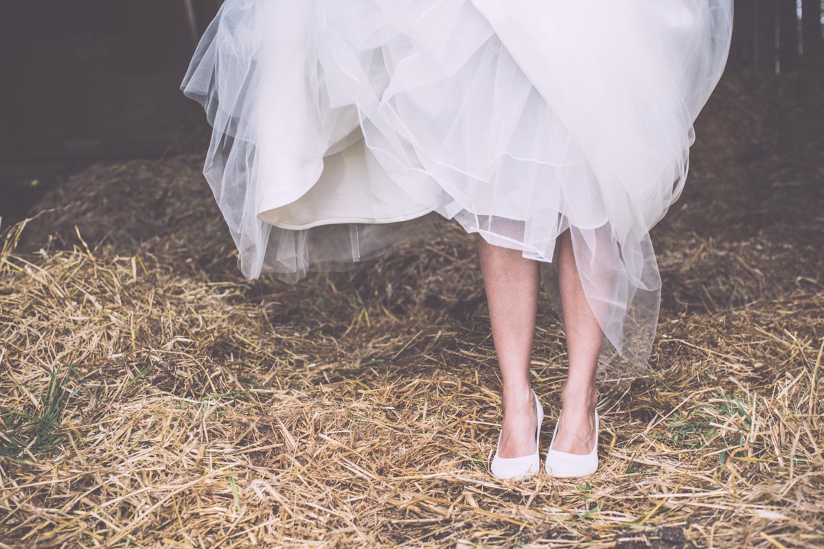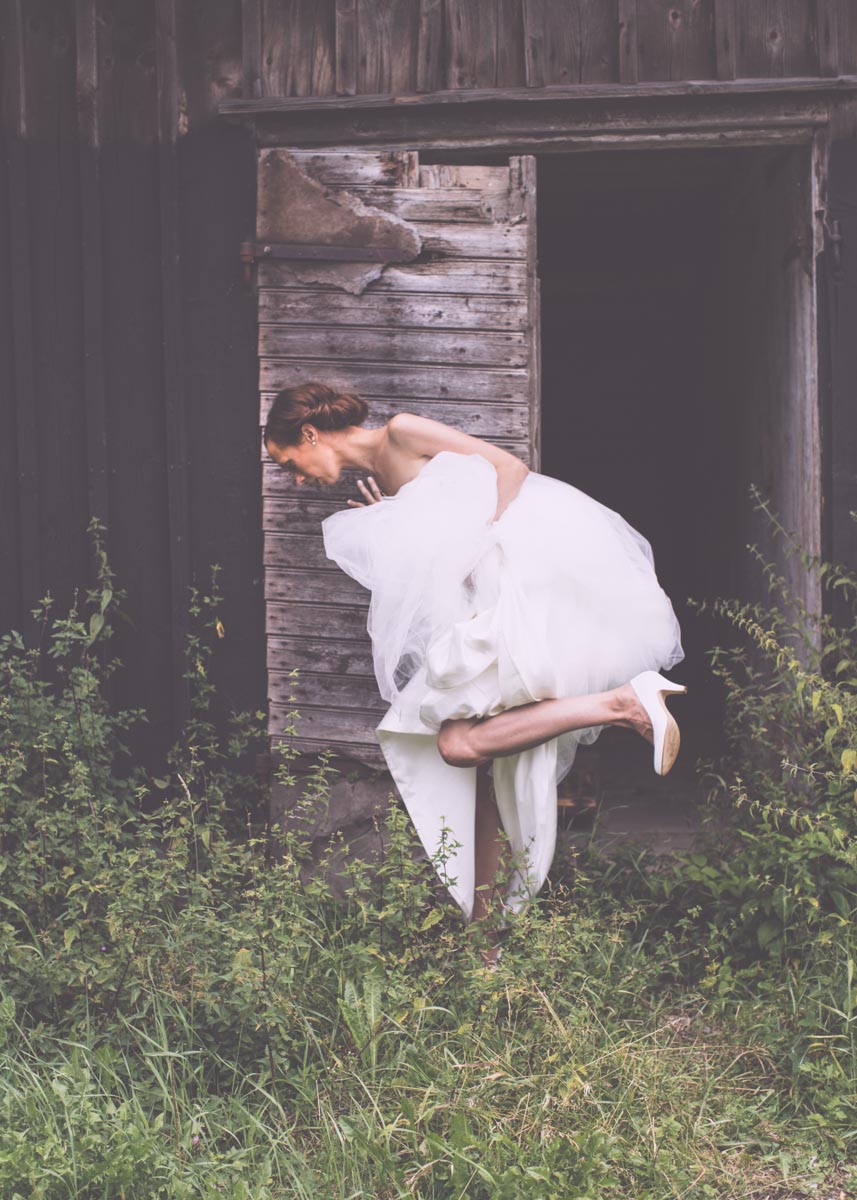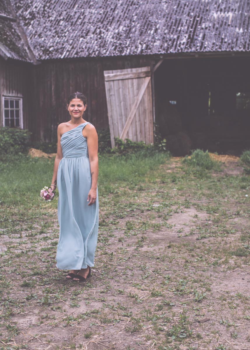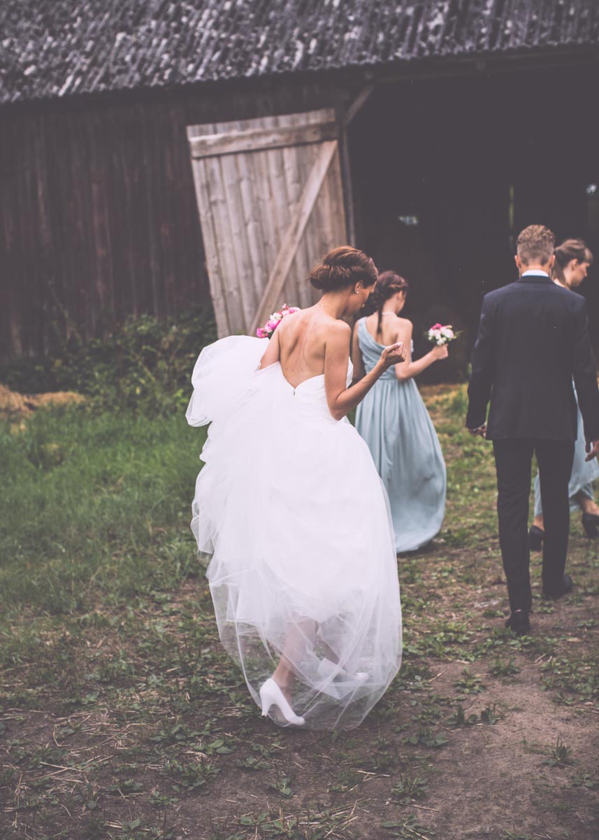 Och den vackra klänningen. Inga sniglar, brännnässlor eller flugor i världen kunde hindra oss från att flytta runt och drapera släpet ut över grästovorna. En riktigt tapper brud.
