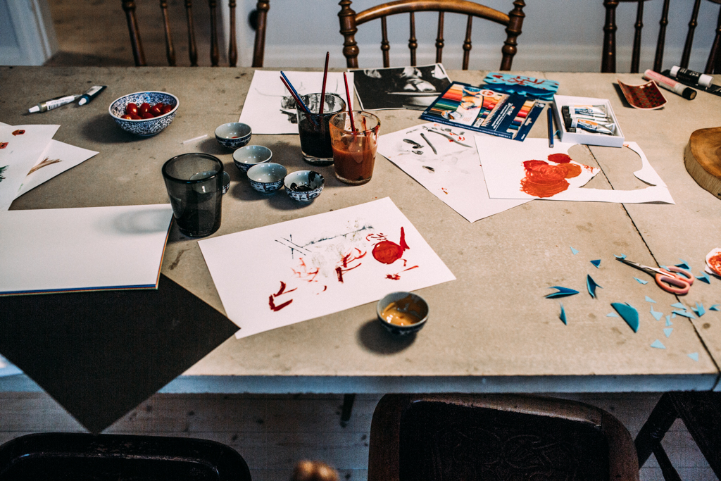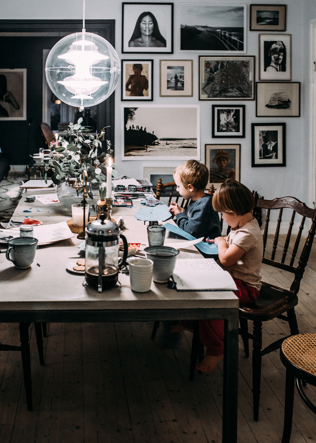 Denna eftermiddag har vi skaparverkstad hemma runt bordet. Vi har inte pysslat med julpynt eller något sådant om du tror det… nä, här gör vi konstverk av sann klass. En fantastisk vulkan och en avtecknad Johnny Depp bland annat…