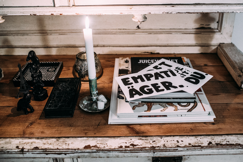 Av Lisa fick vi fina och kloka kort i lördagsgåva. Tack tack. Nu ska jag städa undan vår skaparverkstad och göra ordning inför middag på bordet istället. Fin kväll till dig.