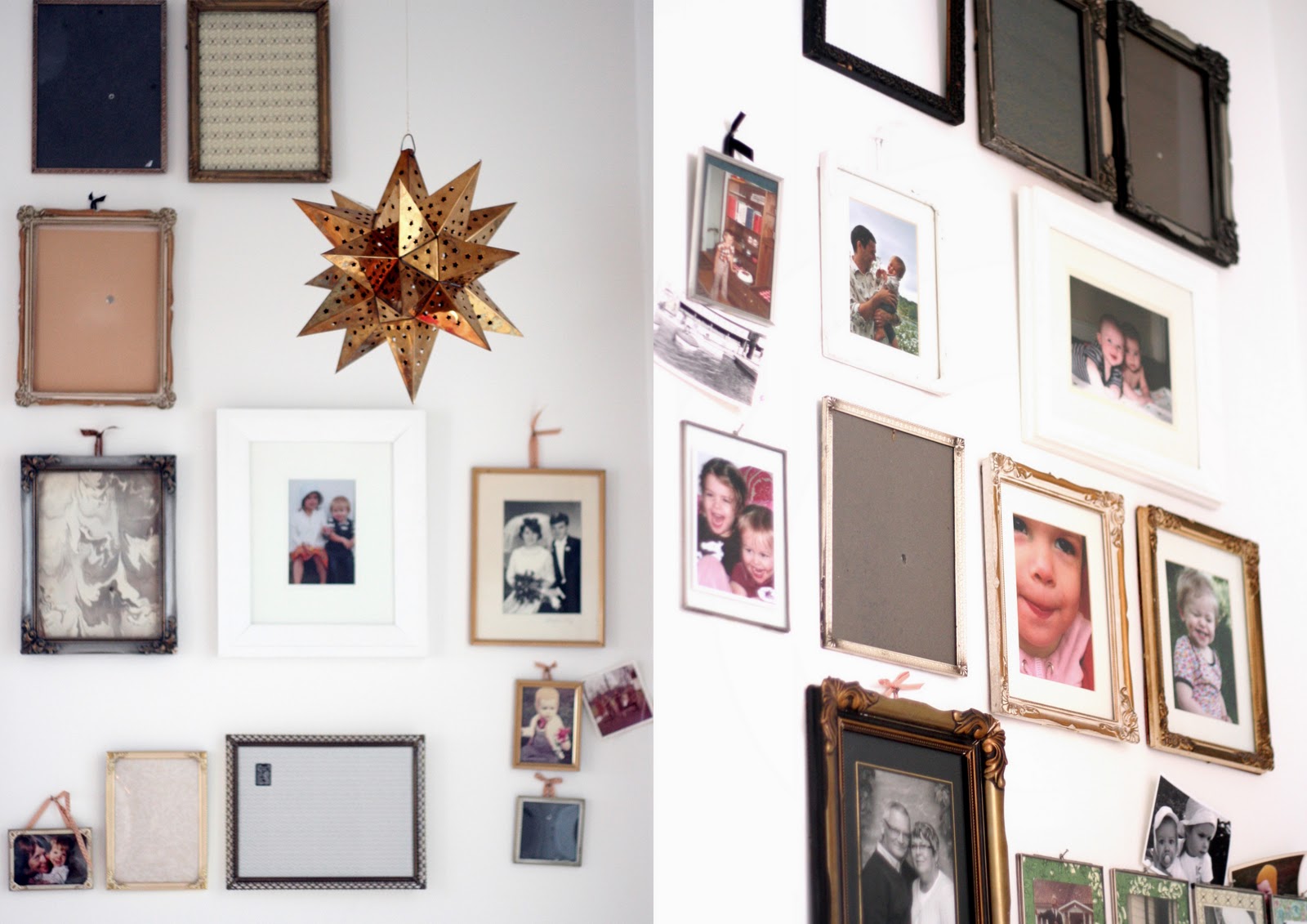 Men nu så. Nu bloggar jag igen och inga mer lov i sikte. Måste ju visa min andra stjärna. Den i guld. Som hamnade i vår ena lilla hall. Som är och förblir ett halvfärdigt projekt. Tanken var att hela den lilla hallen skulle fyllas med ramar och foton. Från golv till tak. Och det är fortfarande planen men jag har tagit en tvåårs-paus verkar det som. Kom av mig alldeles i valet av foton och sen vände loppis-turen med billiga ramar.