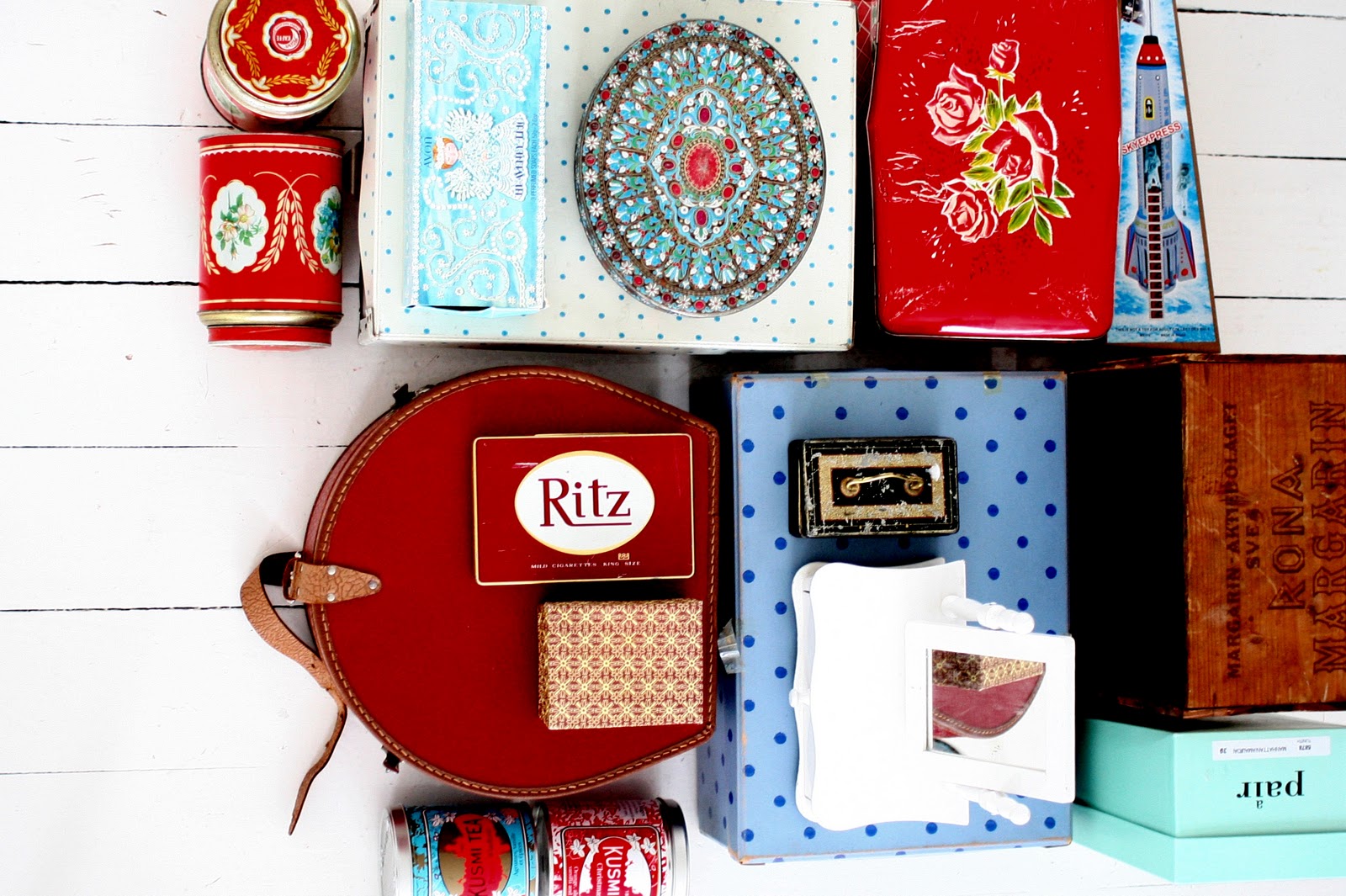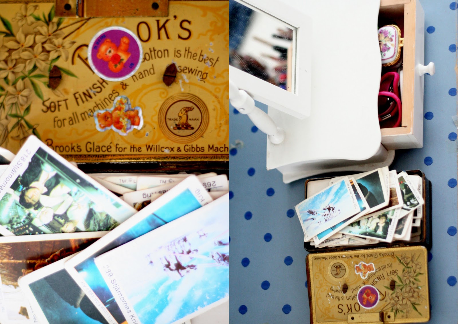 I den blå tvålasken hade jag mina allra finaste klippdockor när jag var liten. Nu har den fyllts på med nya. Och prickiga boxar på loppis kan jag bara inte gå förbi.