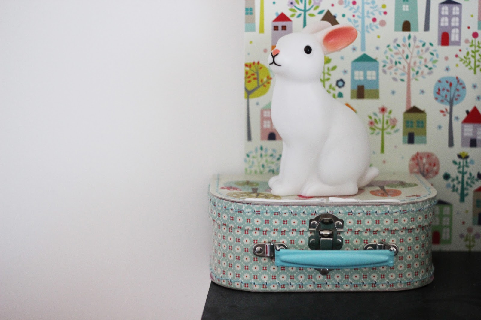Bredvid storebrors säng står kaninen som en liten lysande kompis i mörkret.
