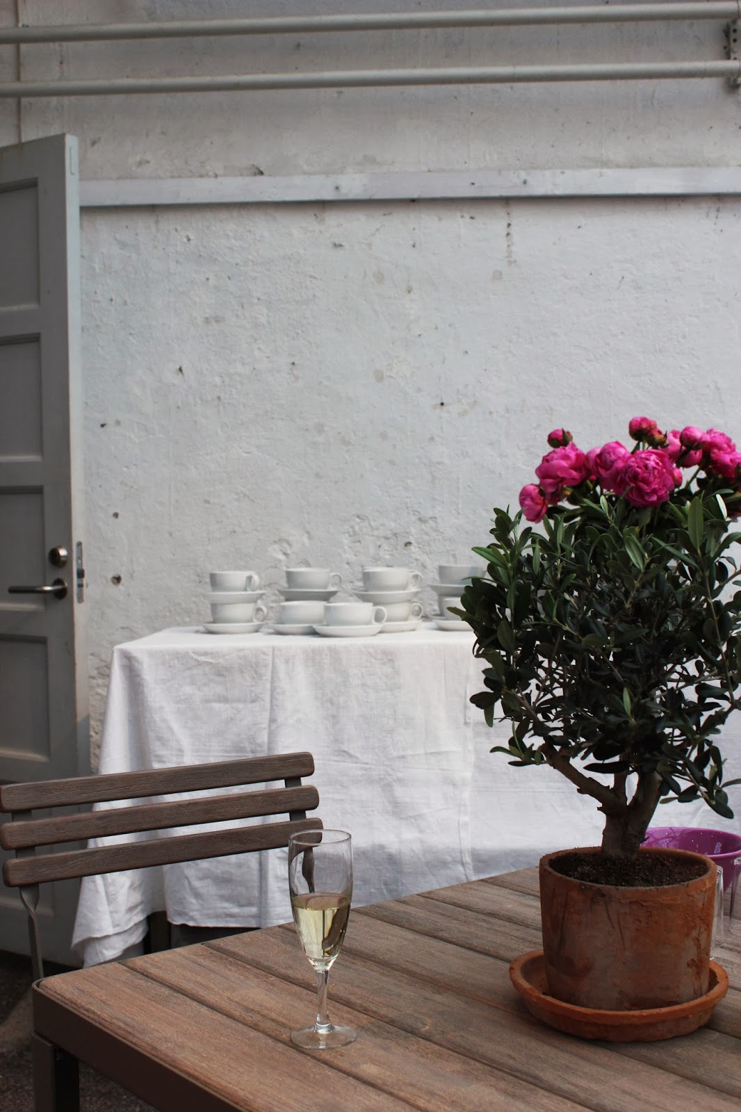 Stora fång pioner på borden, söta bakverk, kaffe och champagne. Lite avlägset från