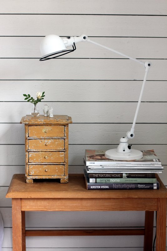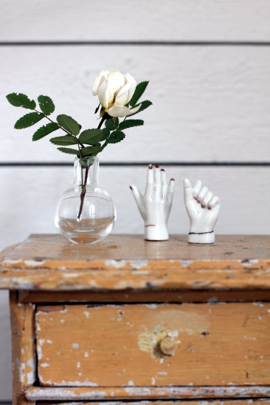 Näe, utan en helt gudomligt söt liten byrå gjord för sådär sjuttio år sen, som mormor & morfar hade med sig till vår lilla tjej när de kom och hälsade på förra veckan. När jag hittade miniatyrhänderna på loppis häromdagen visste jag ju precis var de skulle stå, tillsammans med en liten vas från Svenskt tenn med en miniros från vår trädgård.